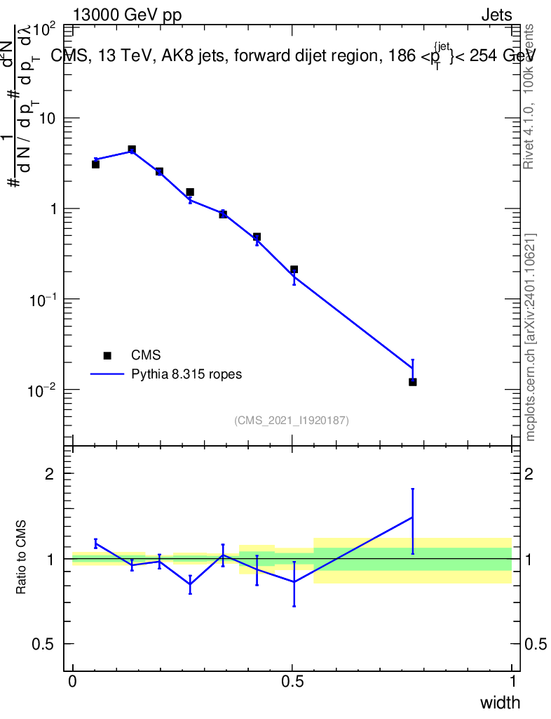 Lines: data, pythia8 8.315 ropes |