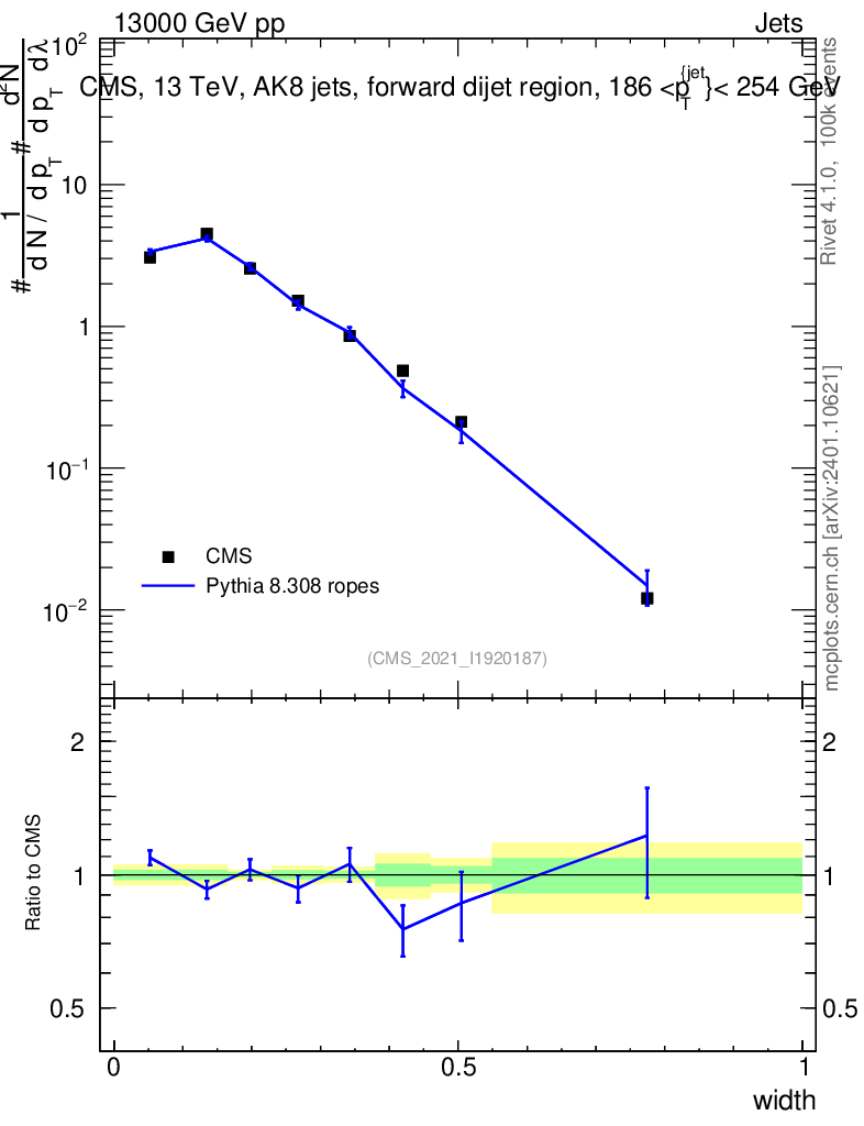 Lines: data, pythia8 8.308 ropes |