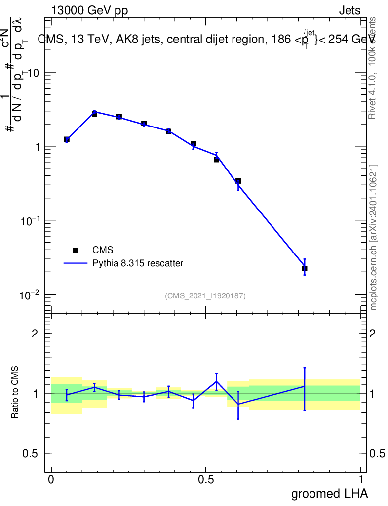 Lines: data, pythia8 8.315 rescatter |