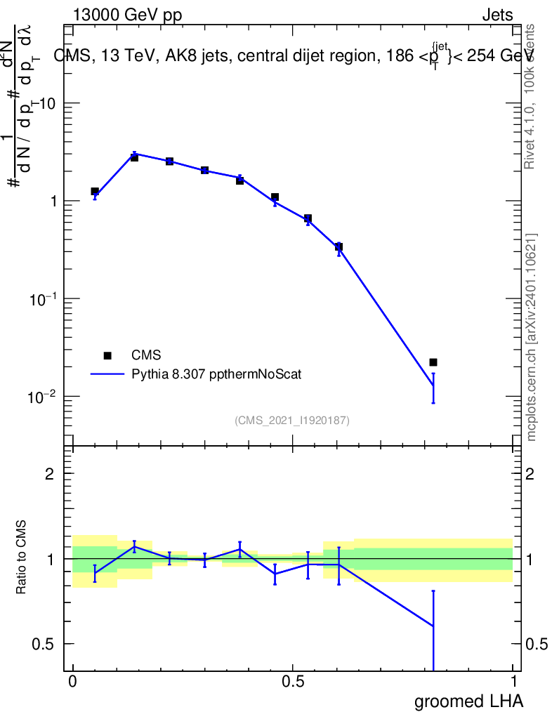 Lines: data, pythia8 8.307 ppthermNoScat |