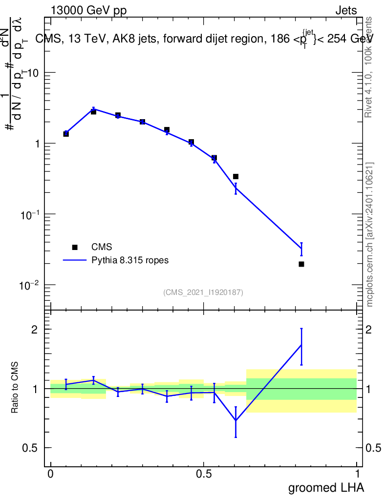 Lines: data, pythia8 8.315 ropes |