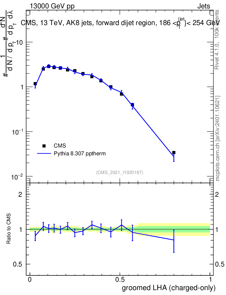Lines: data, pythia8 8.307 pptherm |