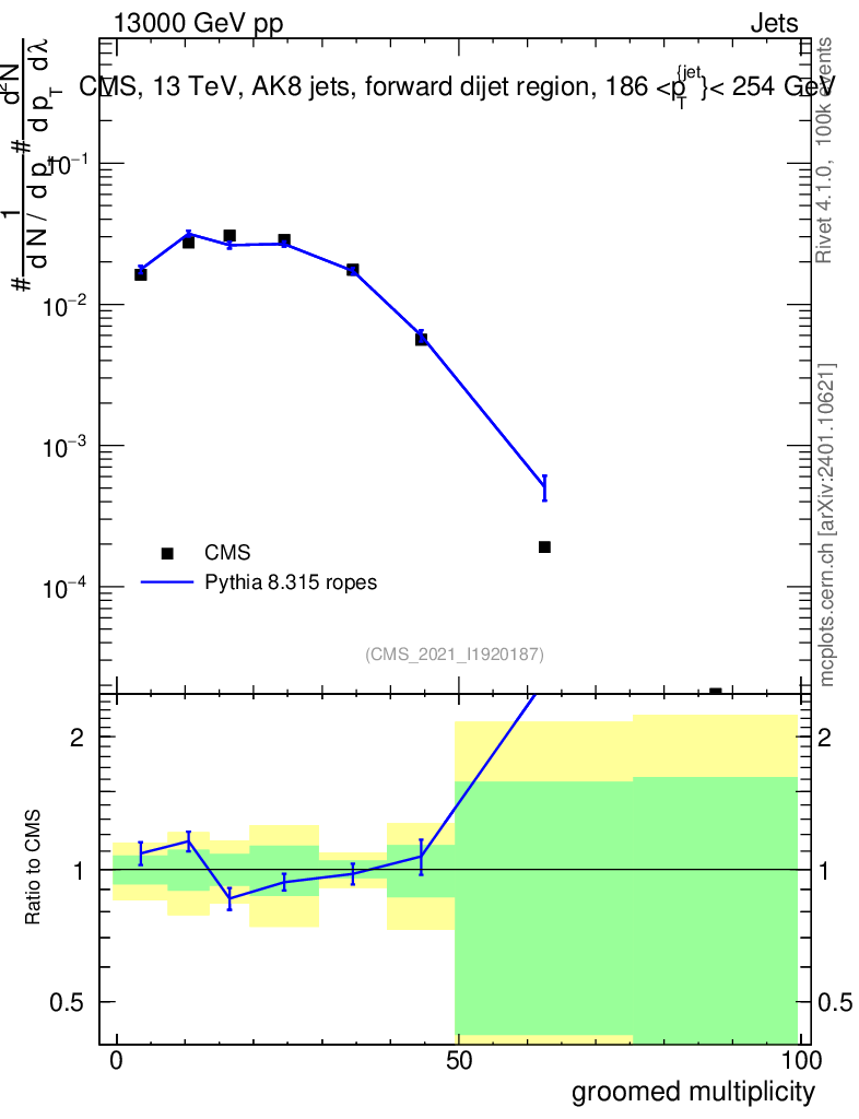 Lines: data, pythia8 8.315 ropes |