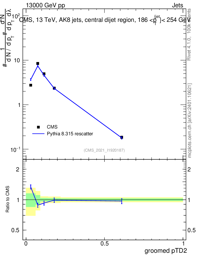 Lines: data, pythia8 8.315 rescatter |