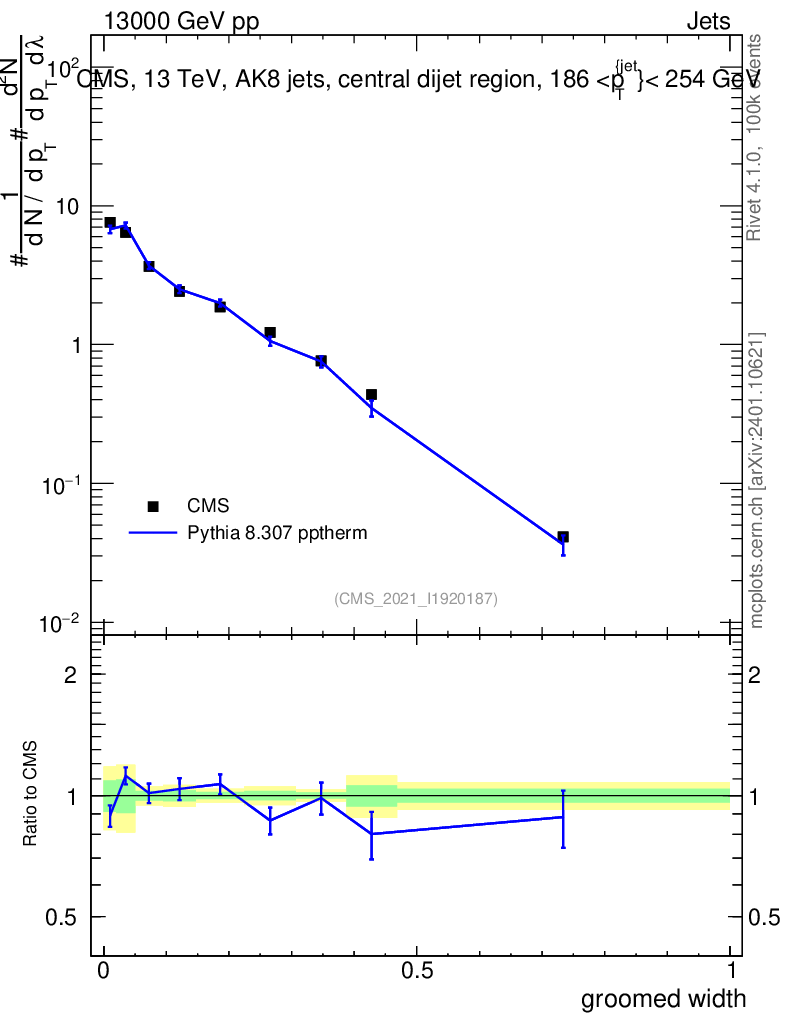 Lines: data, pythia8 8.307 pptherm |