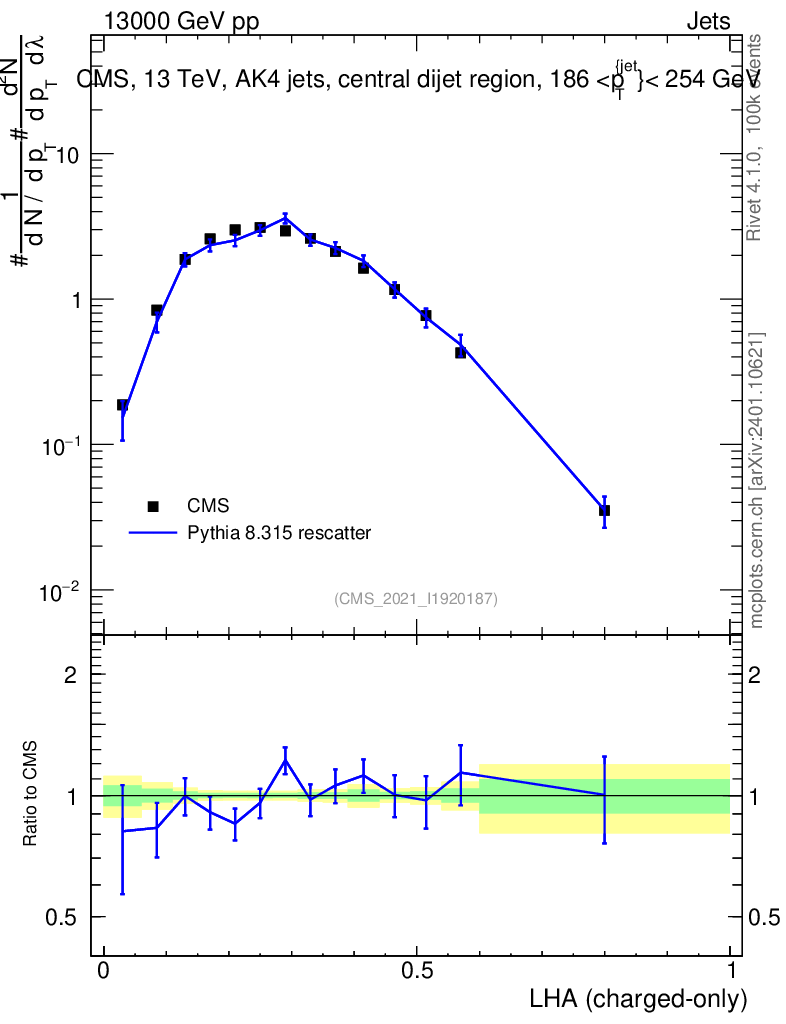 Lines: data, pythia8 8.315 rescatter |