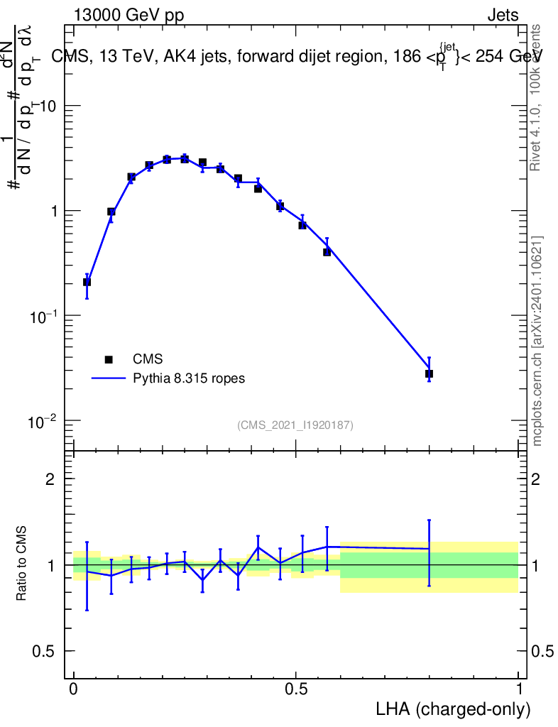 Lines: data, pythia8 8.315 ropes |