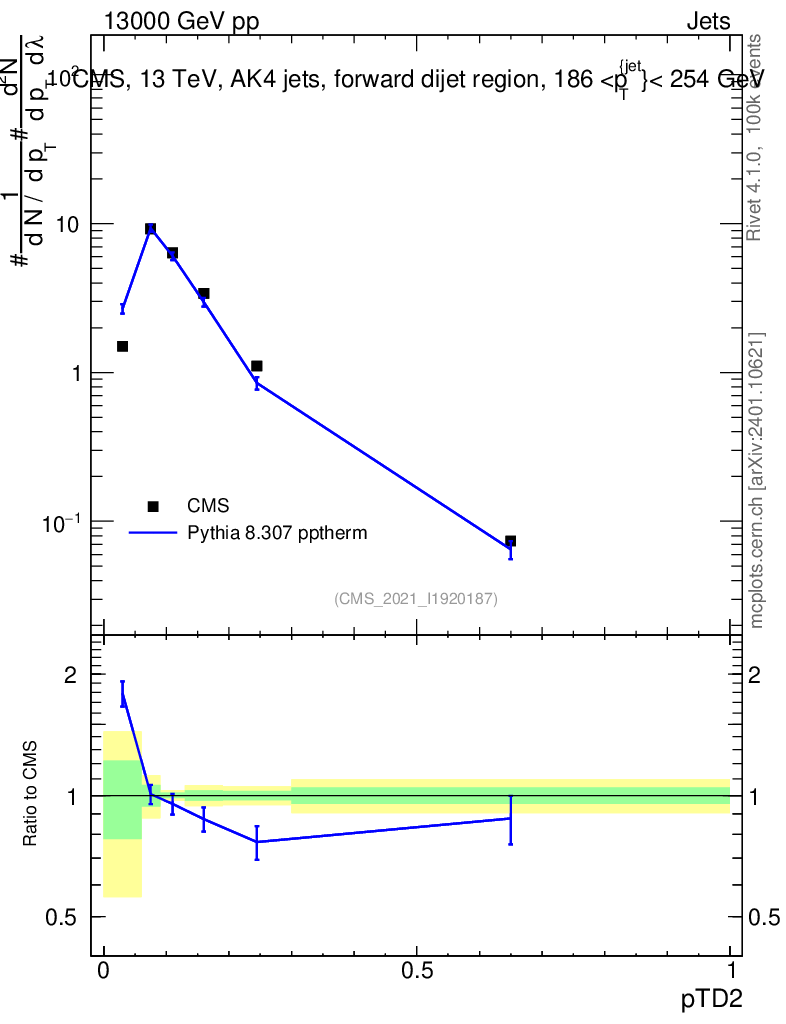 Lines: data, pythia8 8.307 pptherm |