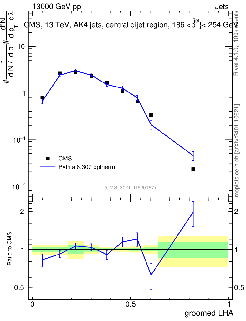 Lines: data, pythia8 8.307 pptherm |