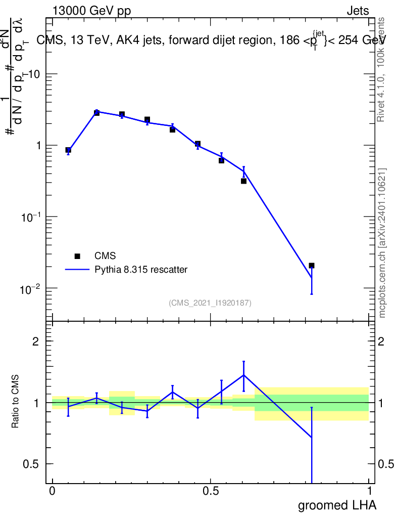 Lines: data, pythia8 8.315 rescatter |
