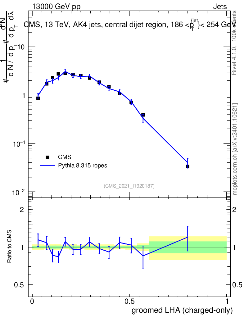 Lines: data, pythia8 8.315 ropes |