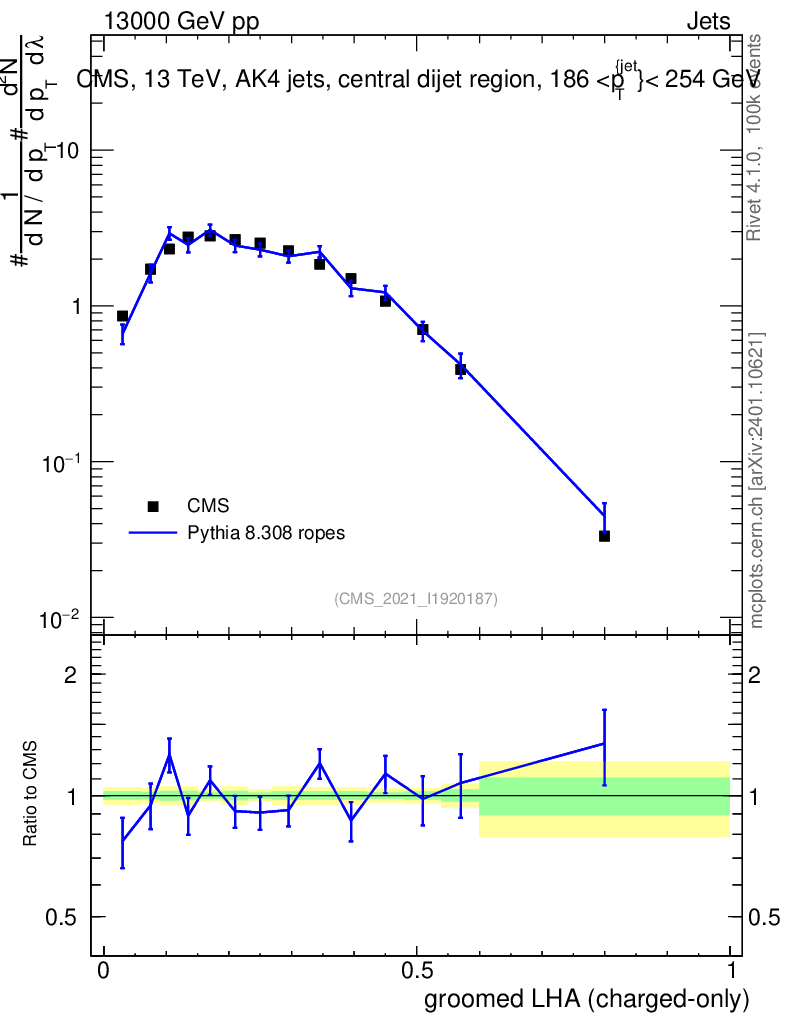 Lines: data, pythia8 8.308 ropes |