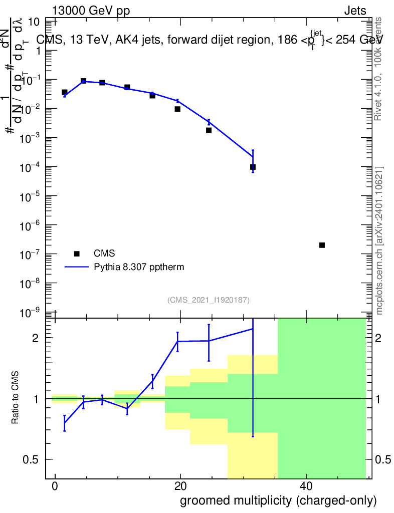 Lines: data, pythia8 8.307 pptherm |