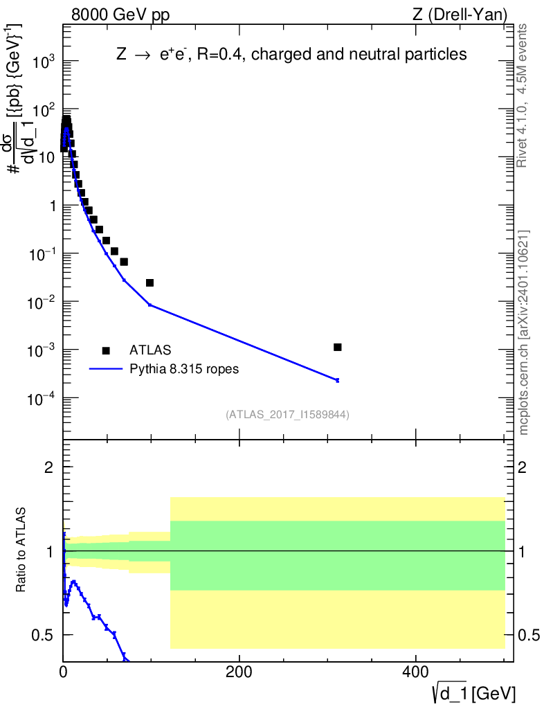 Lines: data, pythia8 8.315 ropes |