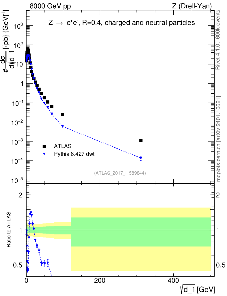 Lines: data, pythia6 6.427 dwt |