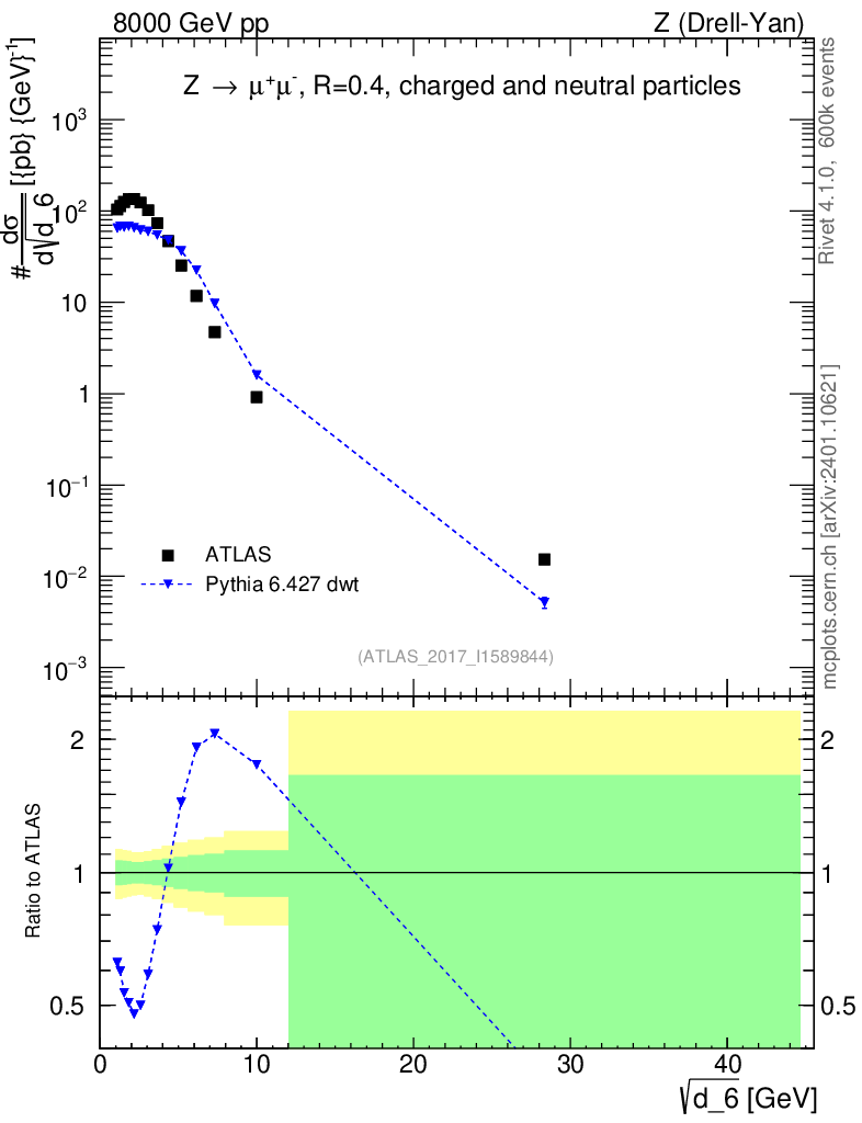 Lines: data, pythia6 6.427 dwt |