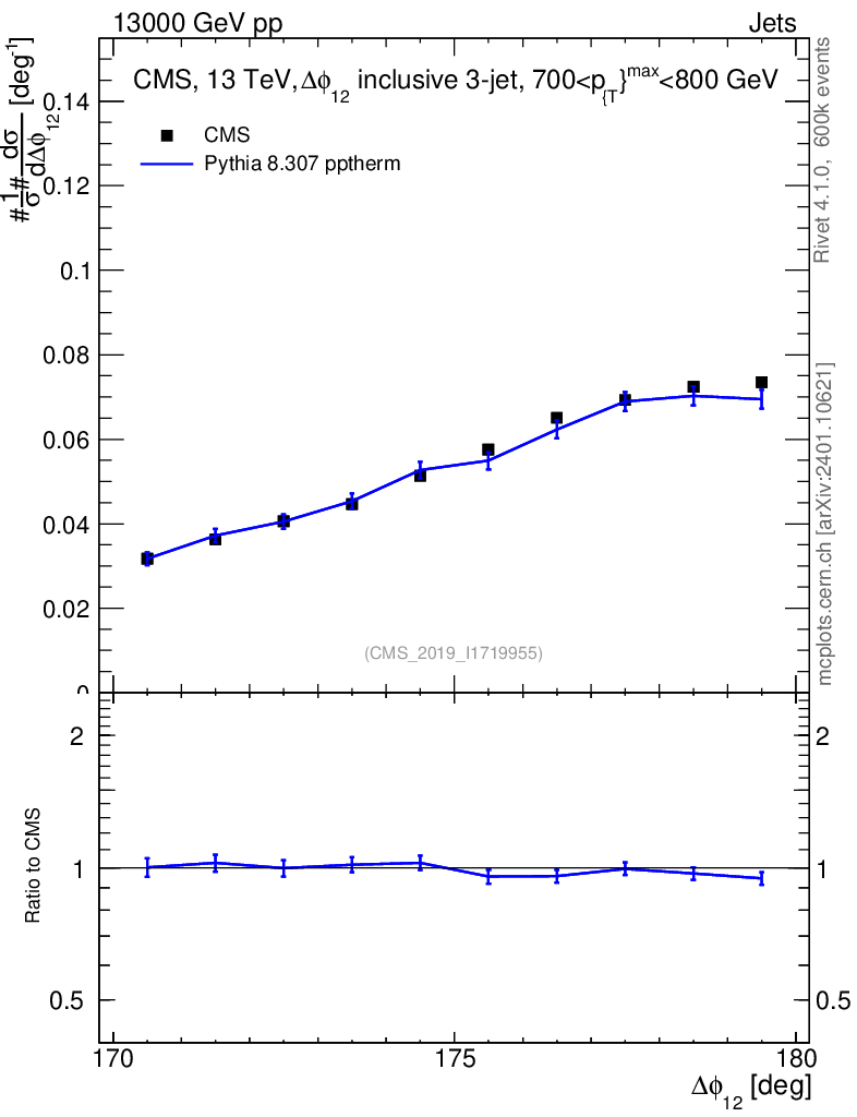 Lines: data, pythia8 8.307 pptherm |