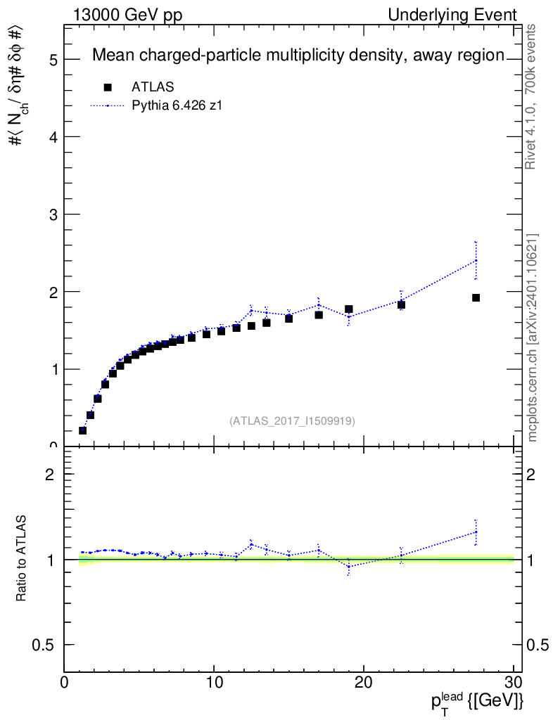 Lines: data, pythia6 6.426 z1 |