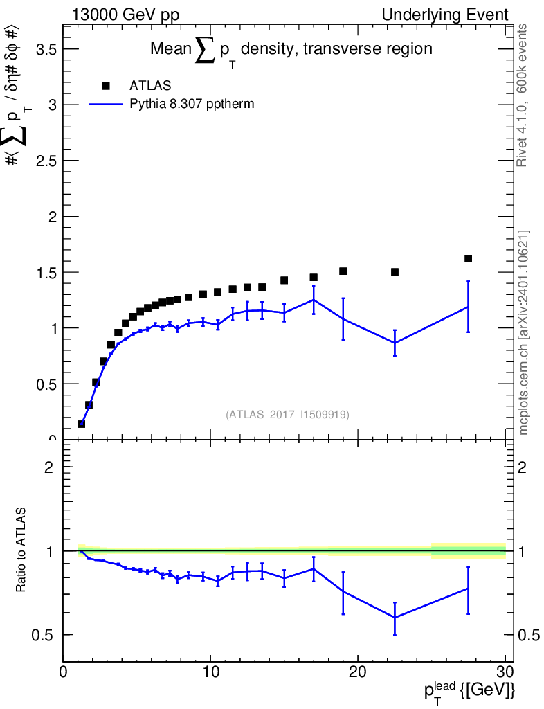 Lines: data, pythia8 8.307 pptherm |
