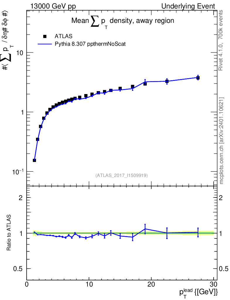 Lines: data, pythia8 8.307 ppthermNoScat |