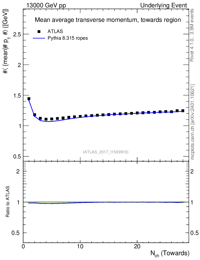 Lines: data, pythia8 8.315 ropes |