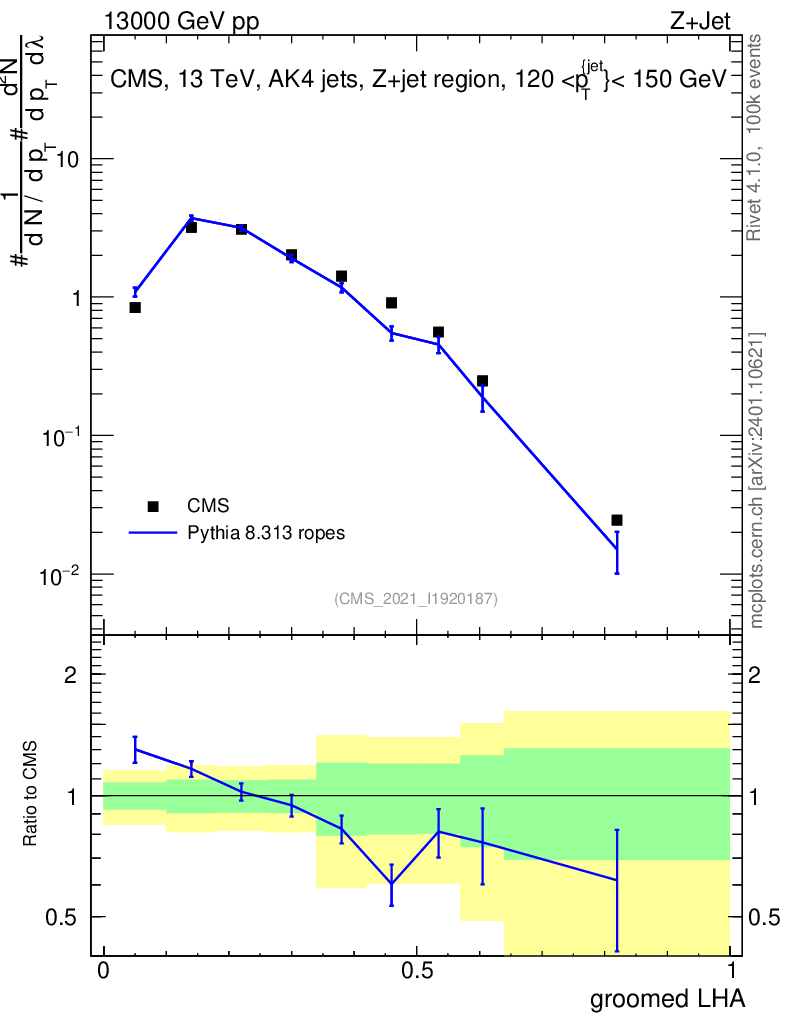 Lines: data, pythia8 8.313 ropes |