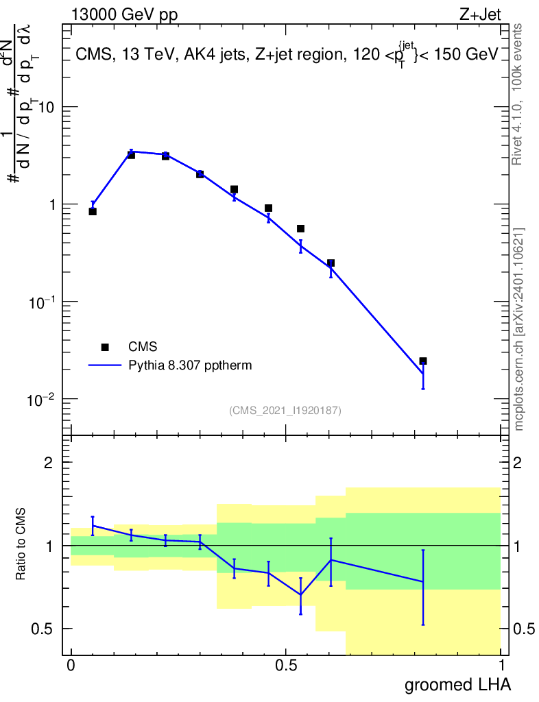 Lines: data, pythia8 8.307 pptherm |