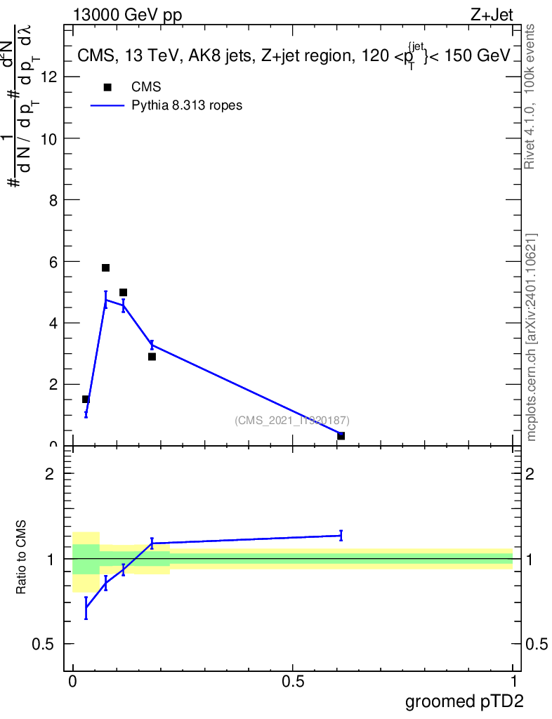 Lines: data, pythia8 8.313 ropes |