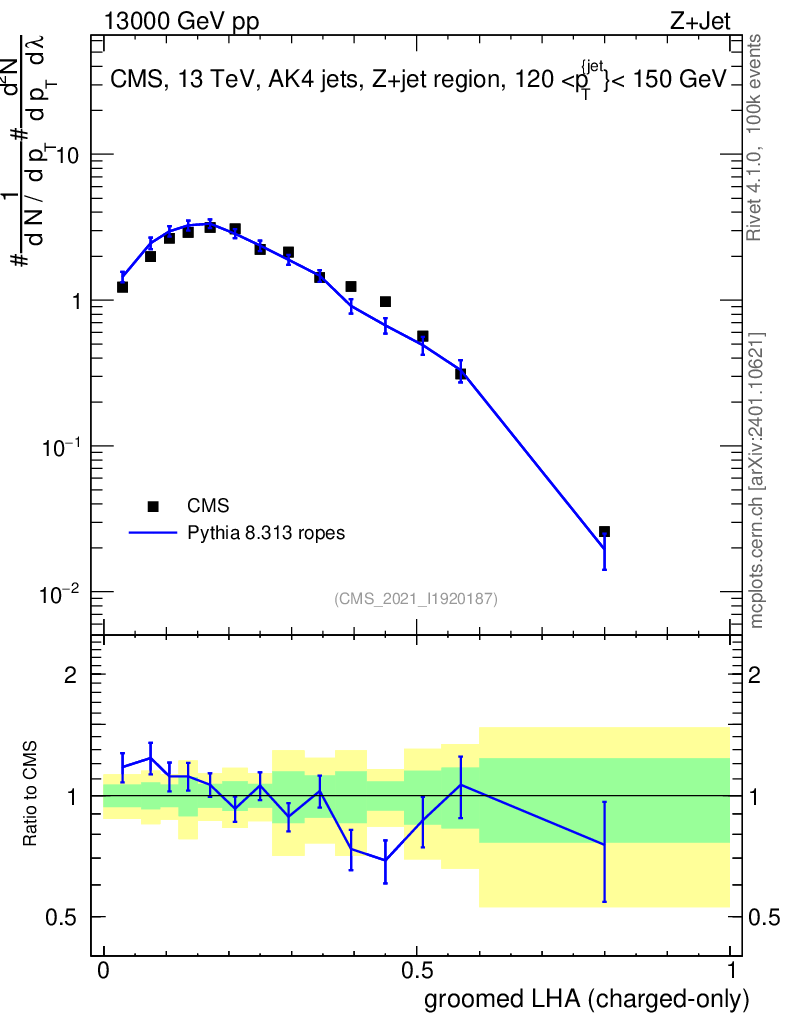 Lines: data, pythia8 8.313 ropes |