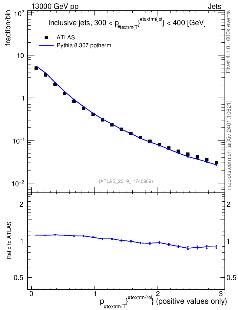 Lines: data, pythia8 8.307 pptherm |