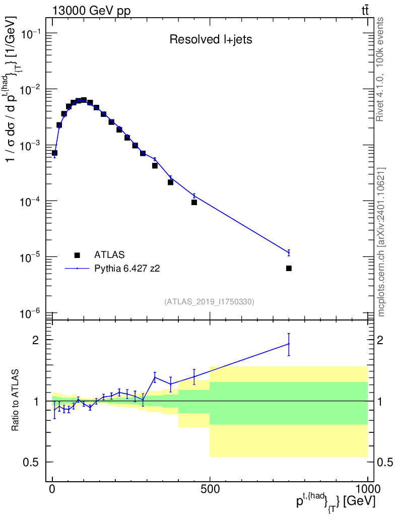 Lines: data, pythia6 6.427 z2 |