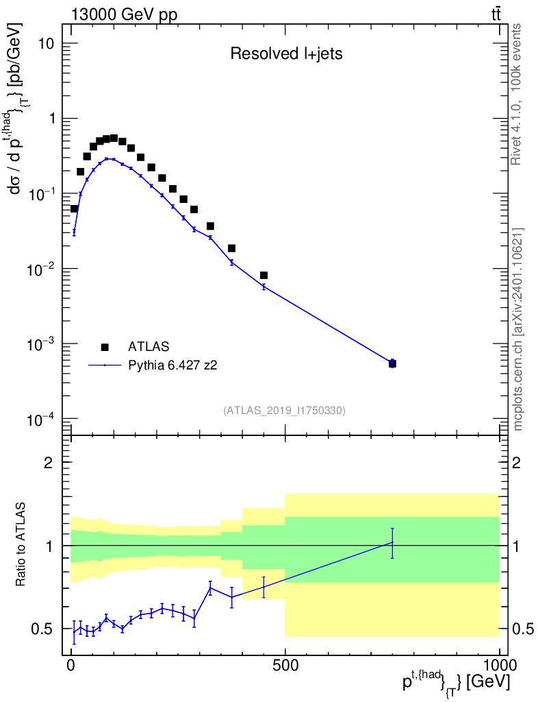 Lines: data, pythia6 6.427 z2 |