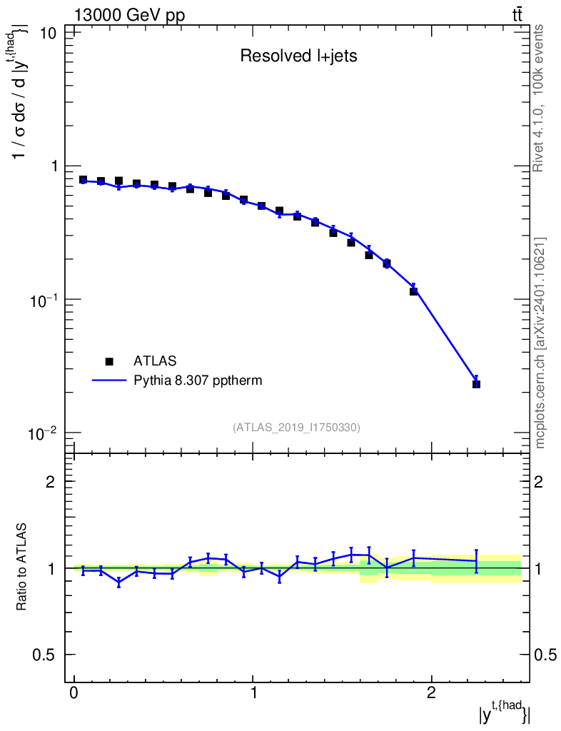 Lines: data, pythia8 8.307 pptherm |