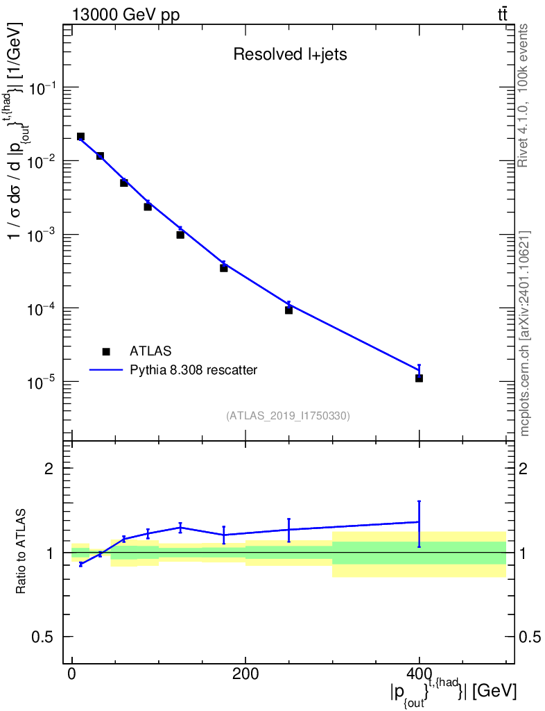 Lines: data, pythia8 8.308 rescatter |