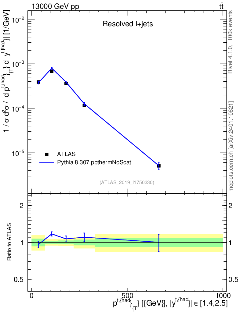 Lines: data, pythia8 8.307 ppthermNoScat |