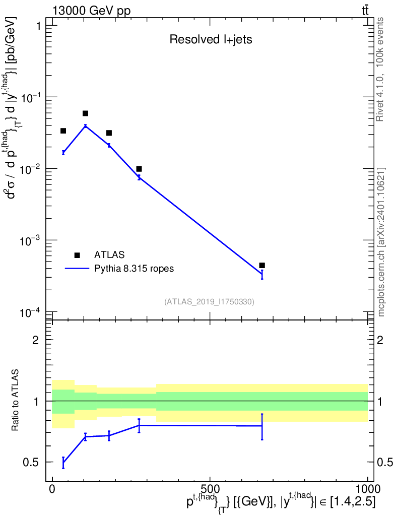 Lines: data, pythia8 8.315 ropes |