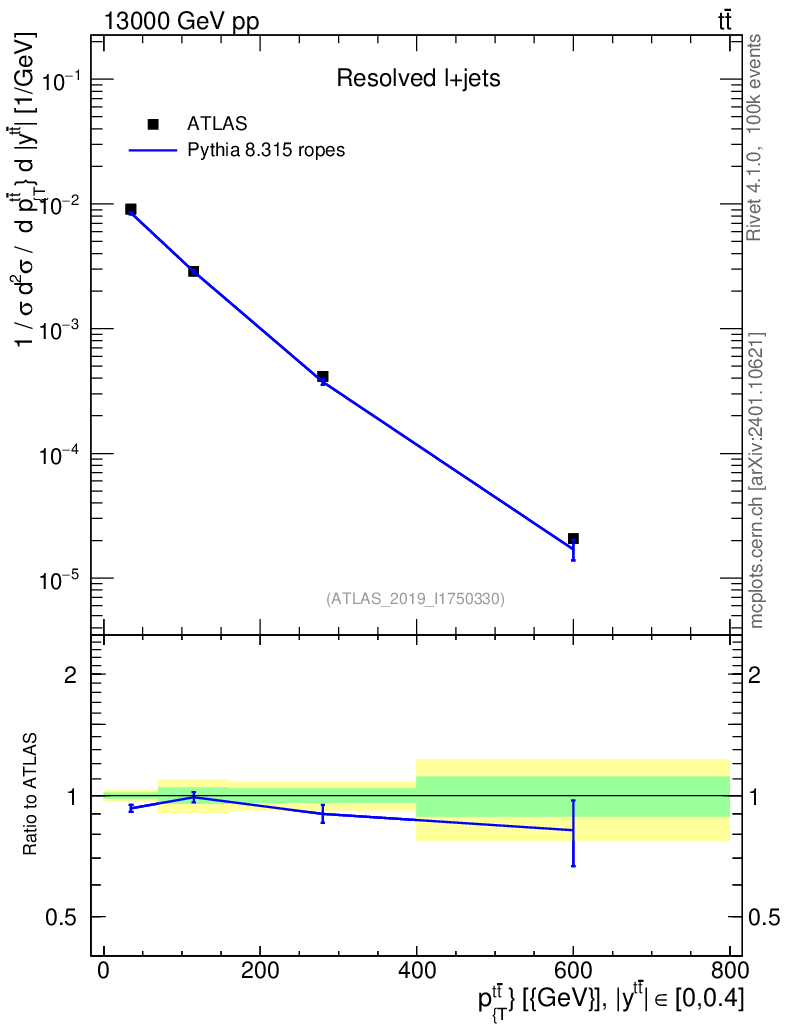 Lines: data, pythia8 8.315 ropes |