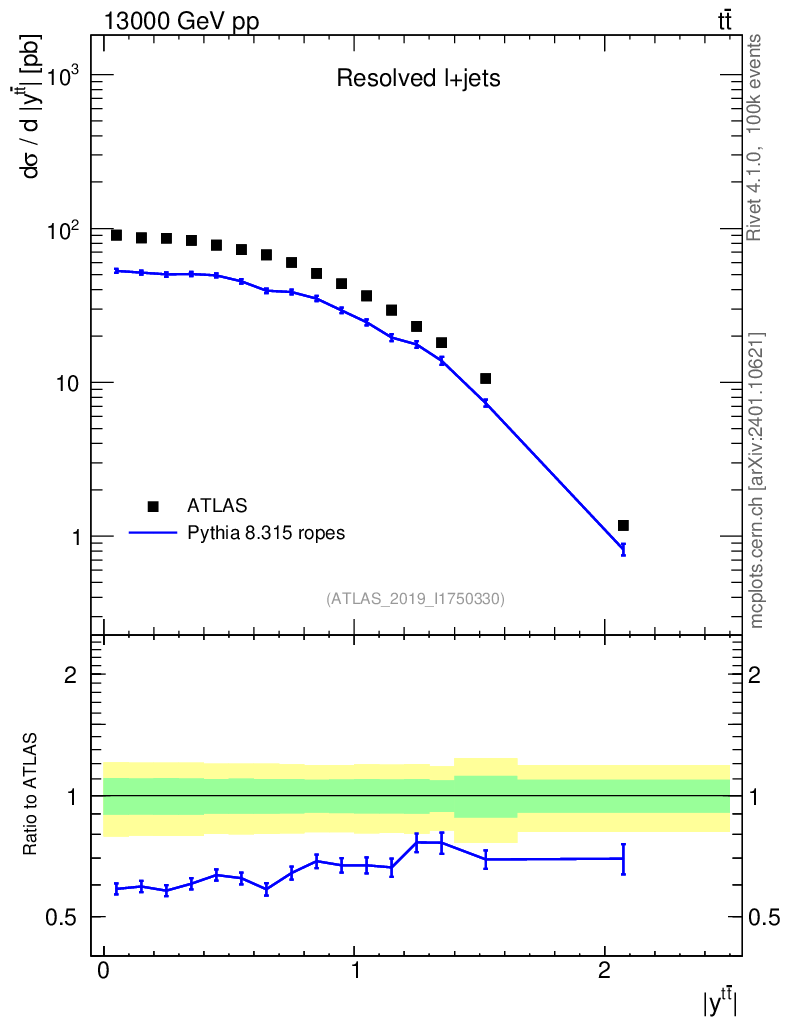 Lines: data, pythia8 8.315 ropes |