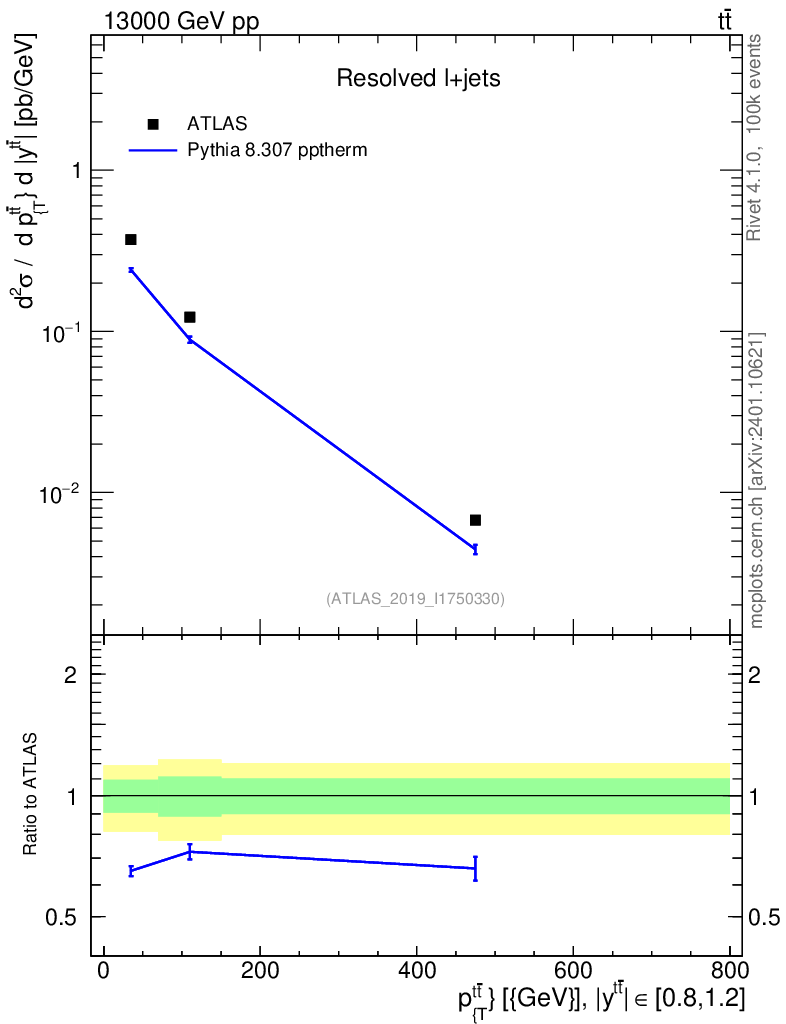 Lines: data, pythia8 8.307 pptherm |