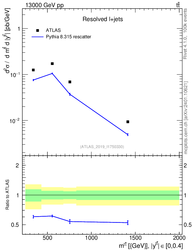 Lines: data, pythia8 8.315 rescatter |
