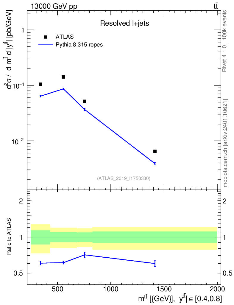 Lines: data, pythia8 8.315 ropes |