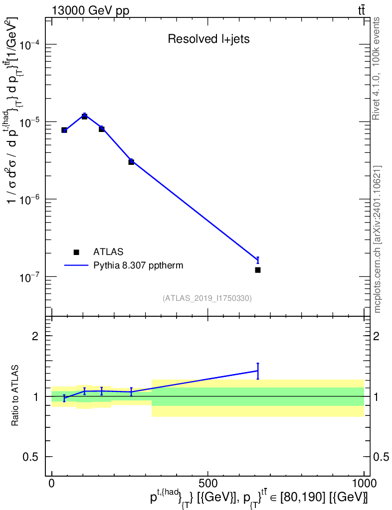 Lines: data, pythia8 8.307 pptherm |