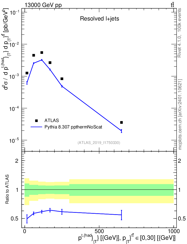 Lines: data, pythia8 8.307 ppthermNoScat |