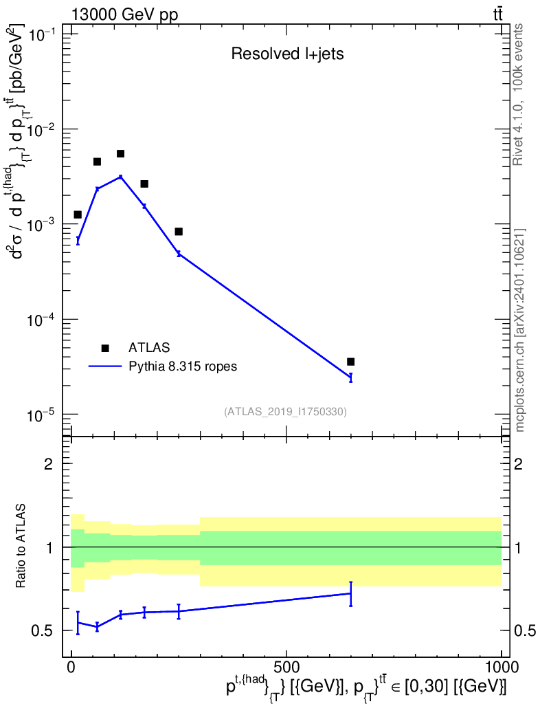 Lines: data, pythia8 8.315 ropes |