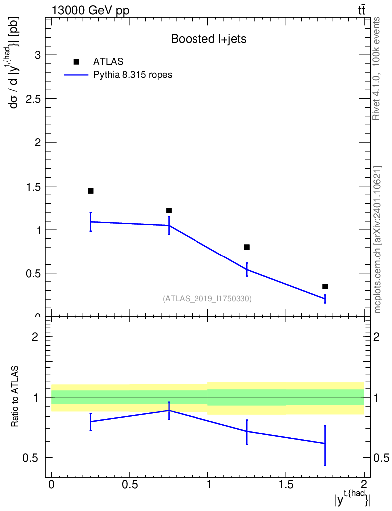 Lines: data, pythia8 8.315 ropes |