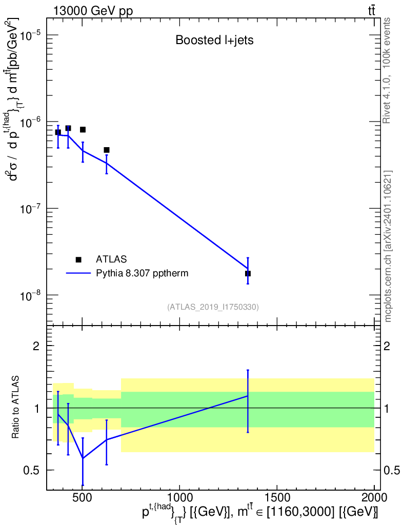 Lines: data, pythia8 8.307 pptherm |