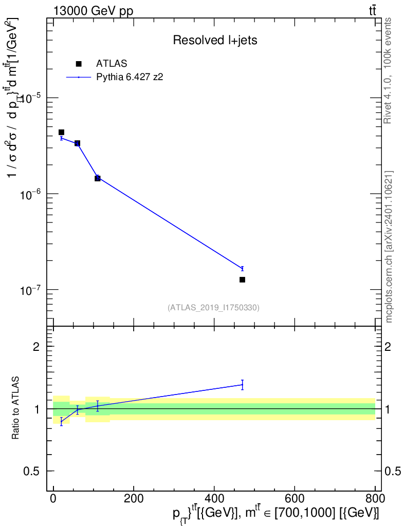 Lines: data, pythia6 6.427 z2 |