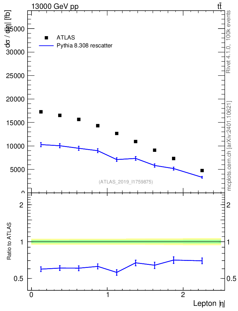 Lines: data, pythia8 8.308 rescatter |