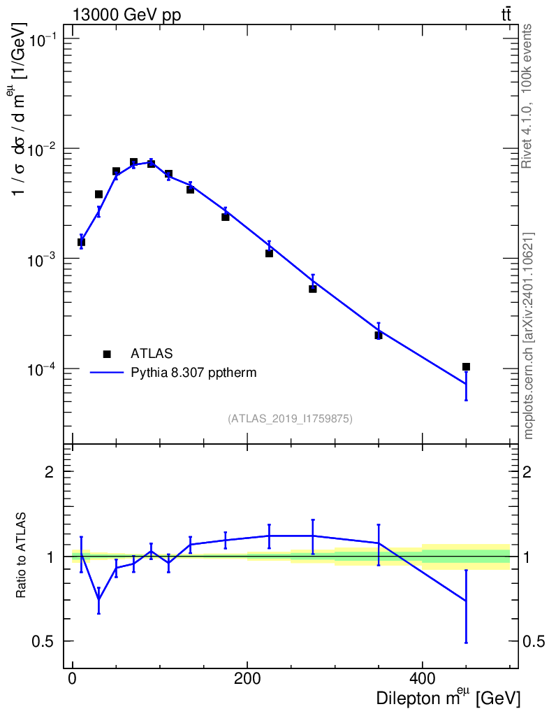 Lines: data, pythia8 8.307 pptherm |