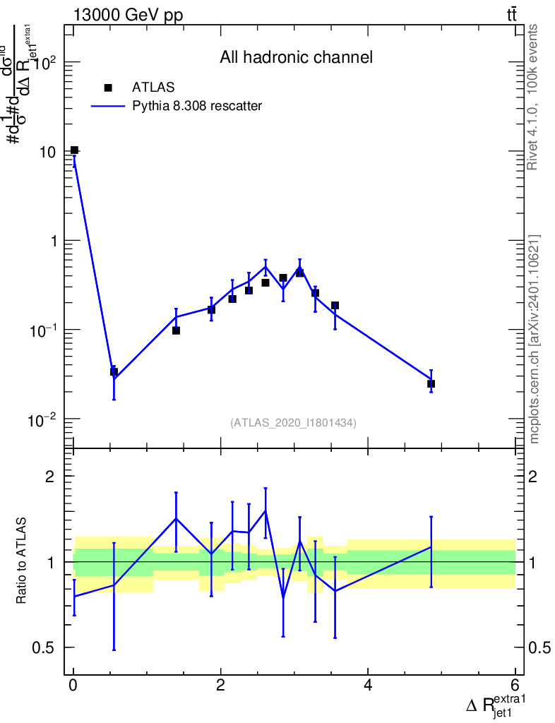 Lines: data, pythia8 8.308 rescatter |